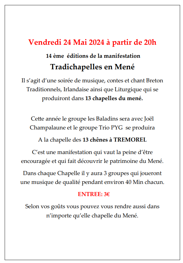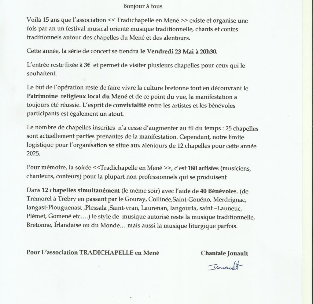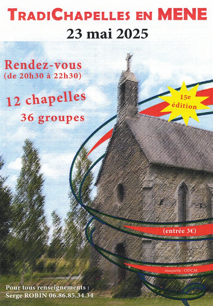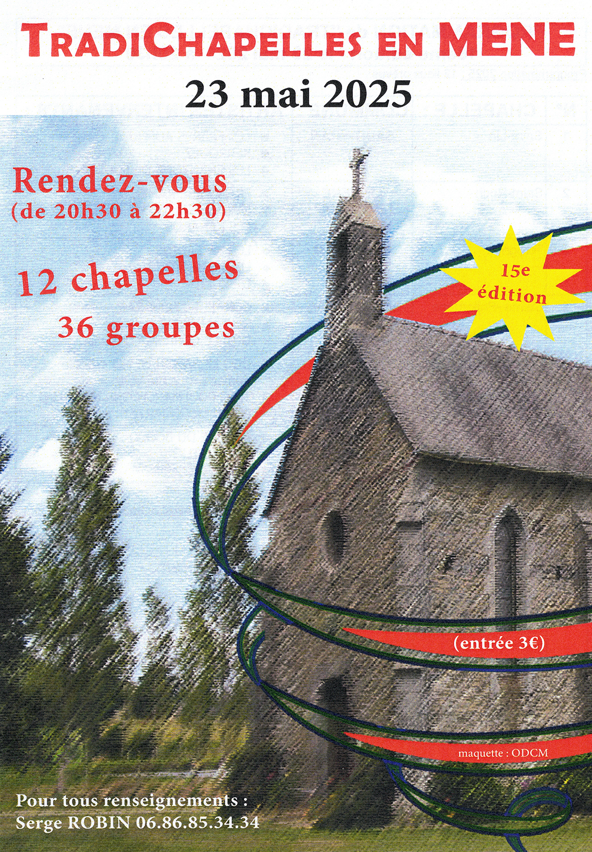Depuis 2008 l’association « Tradichapelle en Mené » existe et organise une fois par an un festival musical orienté musique traditionnelle, chants, et contes autour des chapelles du Mené et des alentours.