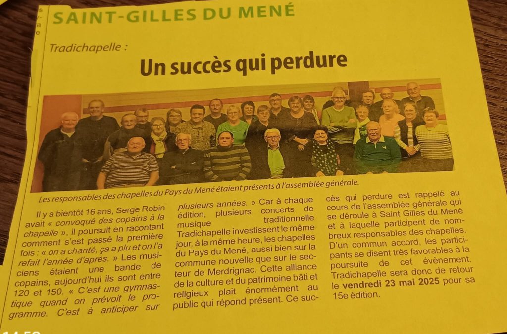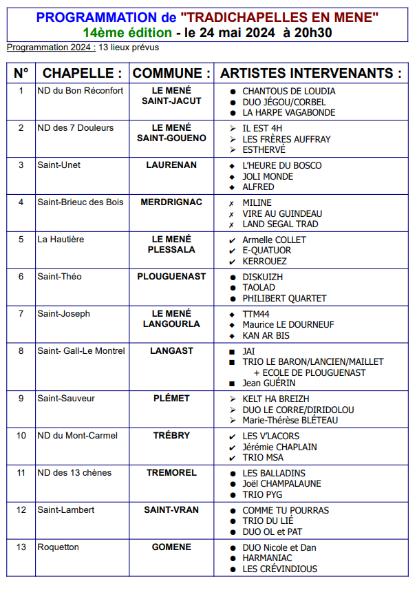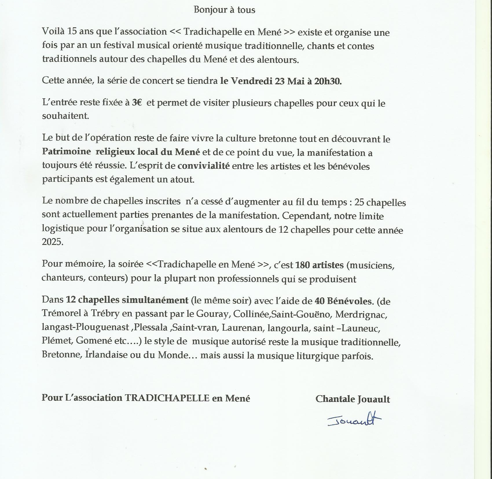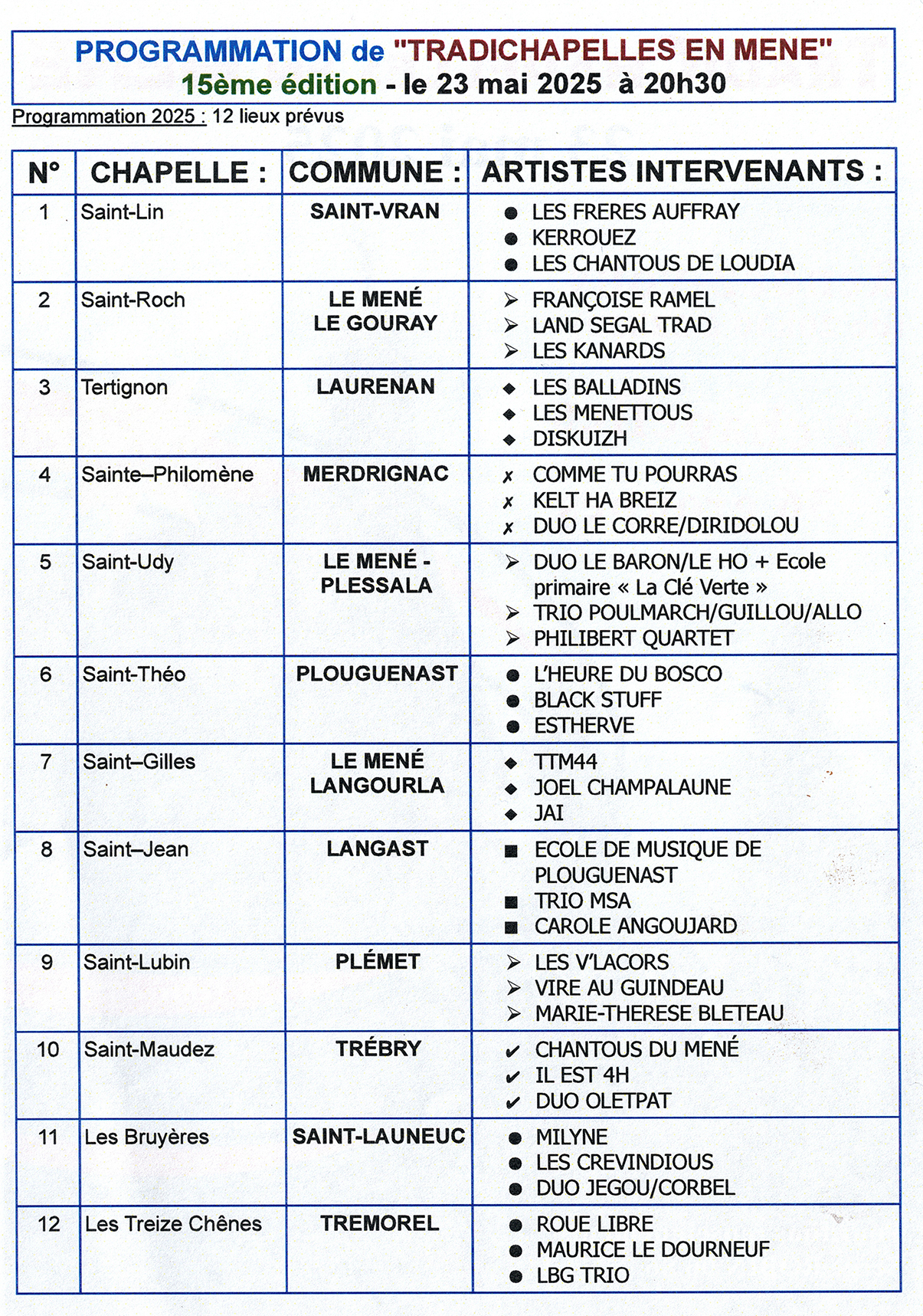 Depuis 2008 l’association « Tradichapelle en Mené » existe et organise une fois par an un festival musical orienté musique traditionnelle, chants, et contes autour des chapelles du Mené et des alentours.